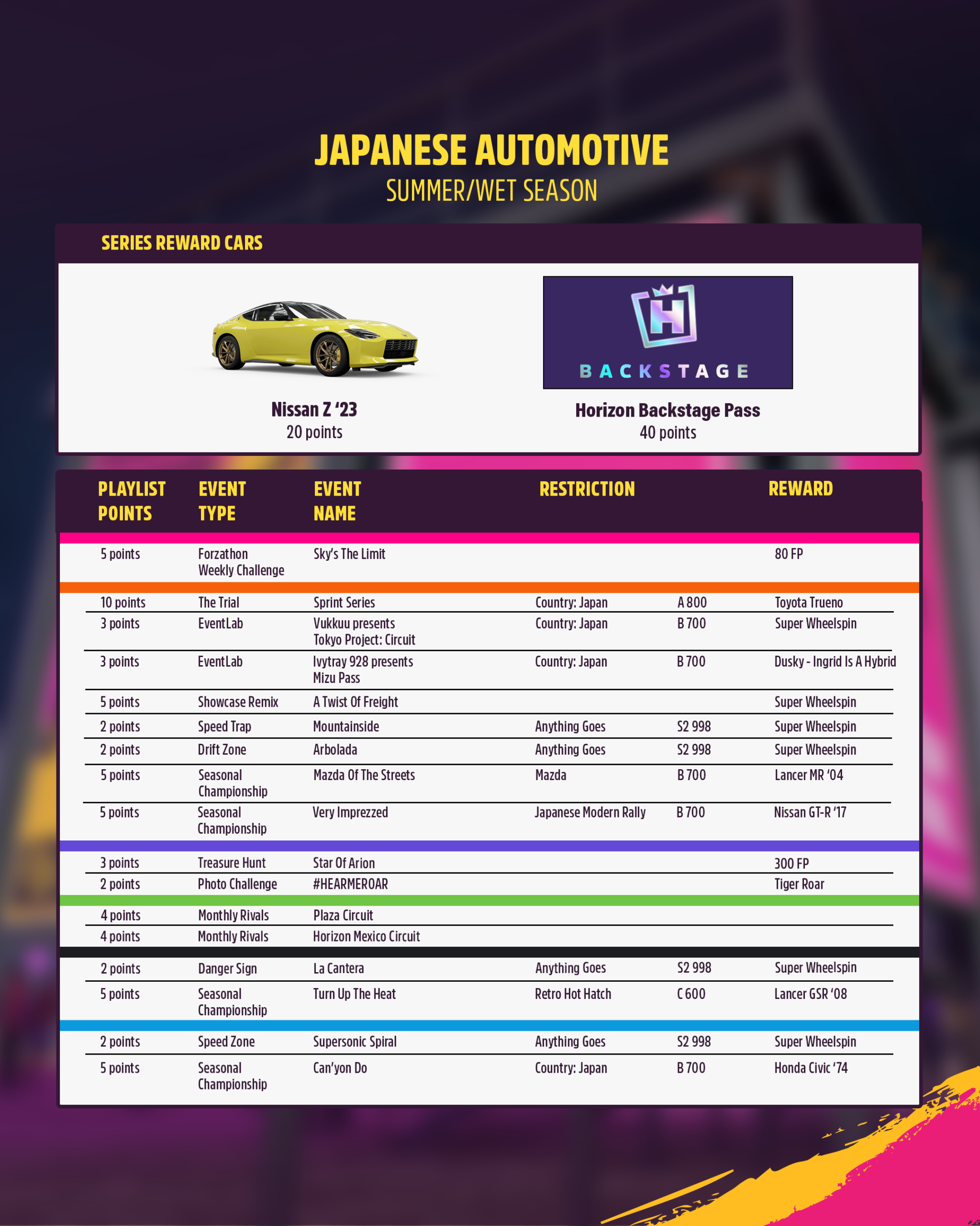 Připravte se na ultimátní road-trip po Mexiku za volantem moderní JDM legendy. Aktuální Festival Playlist oslavuje padesát let automobilového dědictví s novým modelem Nissan Z (2023). Ziskem 20 bodů (PTS) v letní „mokré“ sezóně získáte možnost otestovat jeho třílitrový vidlicový šestiválec twin-turbo, který nabízí výkon 400 koní a točivý moment 475 Nm.