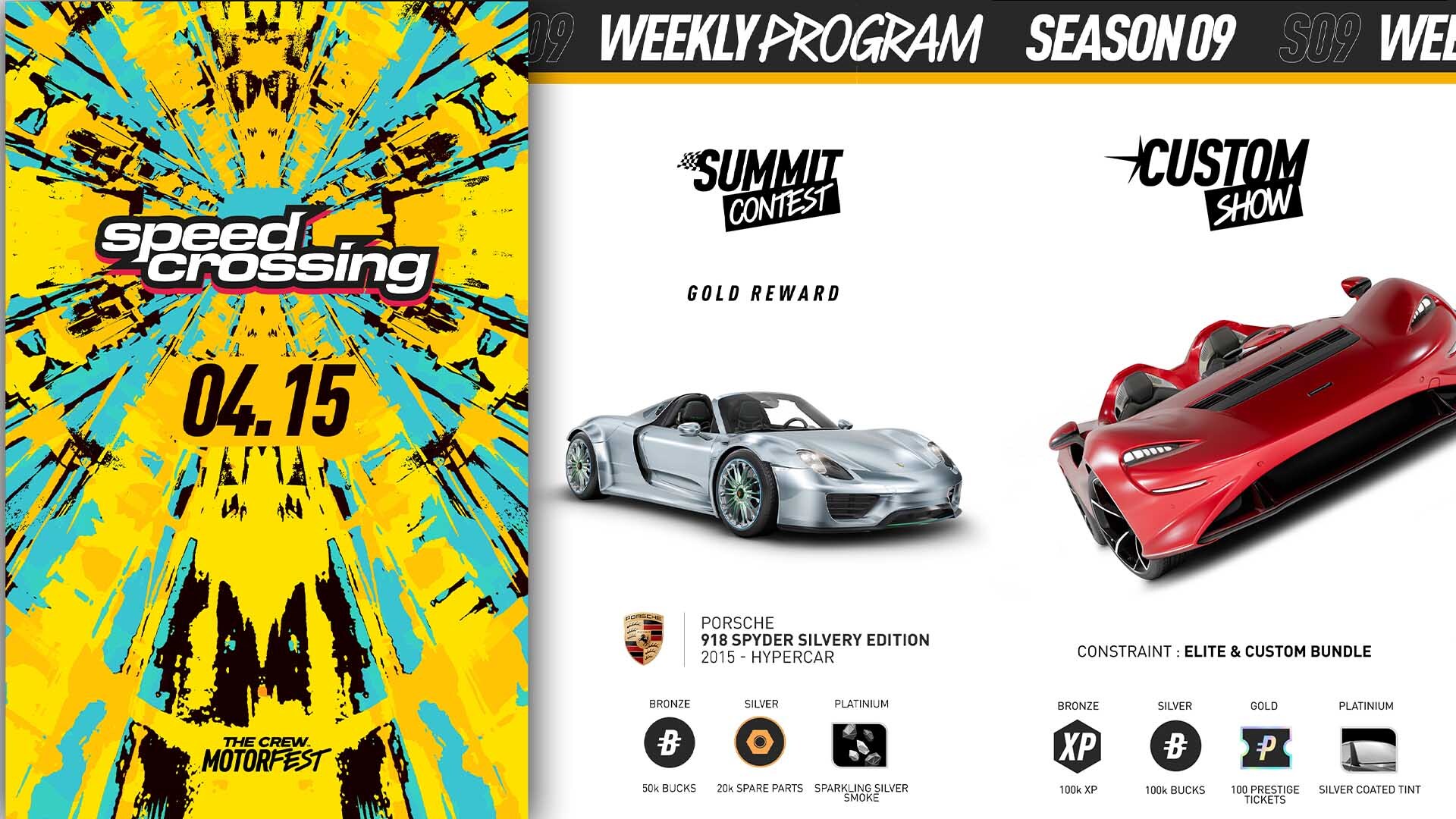 Vítejte u dalšího vydání pravidelného přehledu novinek pro arkádové závody The Crew Motorfest! Tento týden (od 14. dubna) nese podtitul Speed Crossing a tradičně přináší novou porci výzev v rámci Summit Contestu, čerstvou rotaci kosmetických předmětů a to nejlepší z komunitní tvorby.