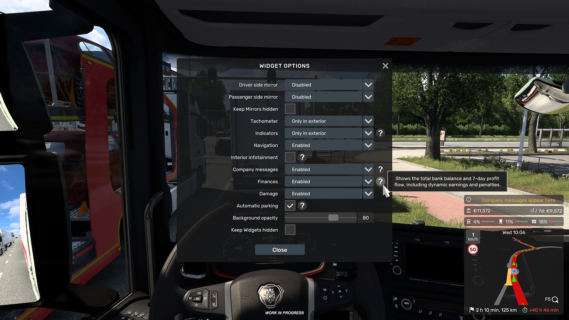 V reakci na odezvu k novému UI vrátili vývojáři do navigace oblíbené přehledy financí a poškození. Jedná se o volitelné widgety pro Route Advisor, které přehledně zobrazí poškození tahače i nákladu a ukáží zůstatek na účtu společně s průměrným ziskem za posledních 7 dní.