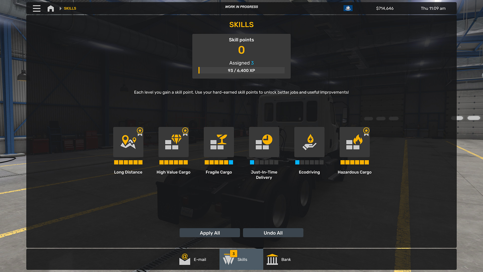 Obrazovka dovedností řidiče dostala svěží vizuální kabátek, ačkoliv její základní fungování zůstává stejné. Hlavním cílem byla lepší přehlednost. Nyní jasně vidíte svou aktuální úroveň a to, co vás čeká v dalším kroku. K dispozici jsou také šikovné tooltípy pro průzkum ostatních hodností v rámci dané dovednosti.