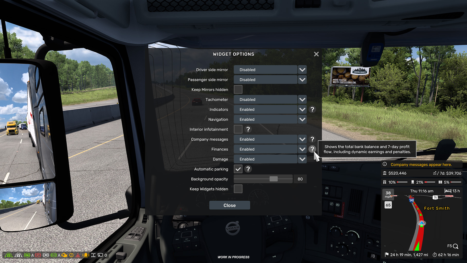 Okamžitě tak uvidíte poškození tahače, případně i návěsu a nákladu. Widget pro finance navíc ukazuje nejen aktuální zůstatek na účtu, ale i průměrný zisk za posledních sedm dní. Kompletní předělání UI v této oblasti se sice stále chystá, ale toto je bleskové řešení nejčastějších žádostí ze strany komunity.