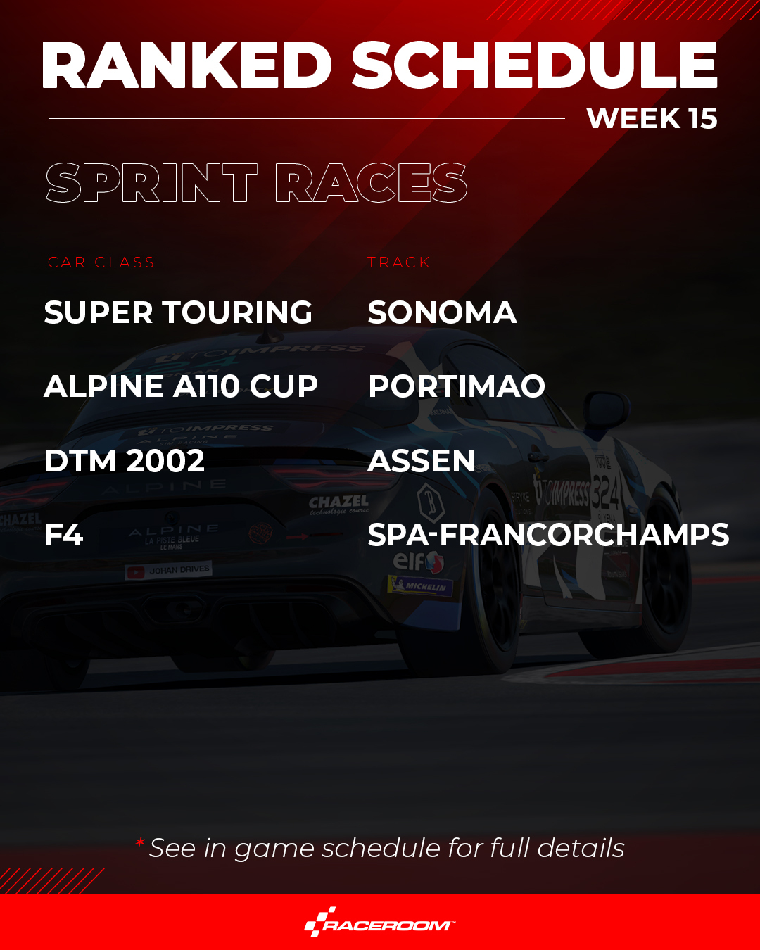• Sprinty (Sprint races): Nechybí bezplatný Alpine A110 Cup na Portimau (FREE), dále legendární Super Touring vozy v Sonomě, klasické DTM 2002 v Assenu a formulová F4 na Spa-Francorchamps.