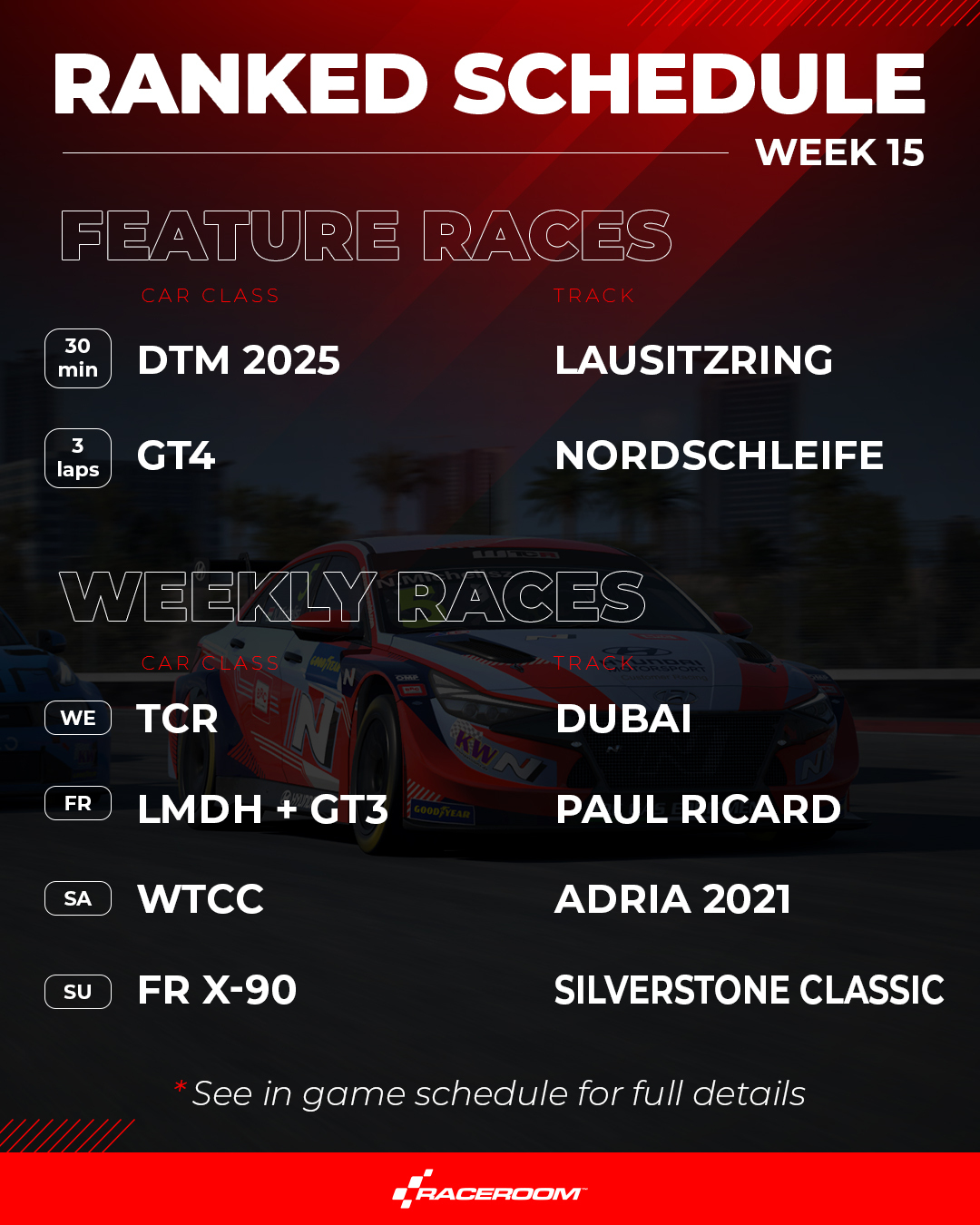 • Týdenní závody (Weekly races): Pro milovníky delších bitev jsou připraveny kombinace TCR v Dubaji, LMDh + GT3 na Paul Ricard, WTCC v Adrii a historické formule FR X-90 na klasickém britském Silverstonu.