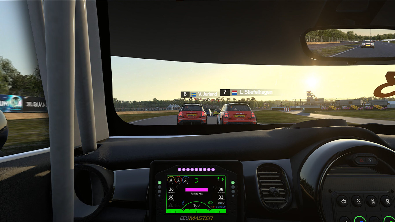 Technická zajímavost: Vůz obsahuje autentickou závodní elektroniku. Režim Push-to-Pass musíte nejprve dedikovaným tlačítkem „nabít“. Po 5 vteřinách se systém aktivuje a vy máte 5vteřinové okno pro jeho spuštění. Pokud to nestihnete, o jeden ze dvou povolených boostů v relaci přijdete. Stejné tlačítko slouží i pro Launch mode při startu do závodu.